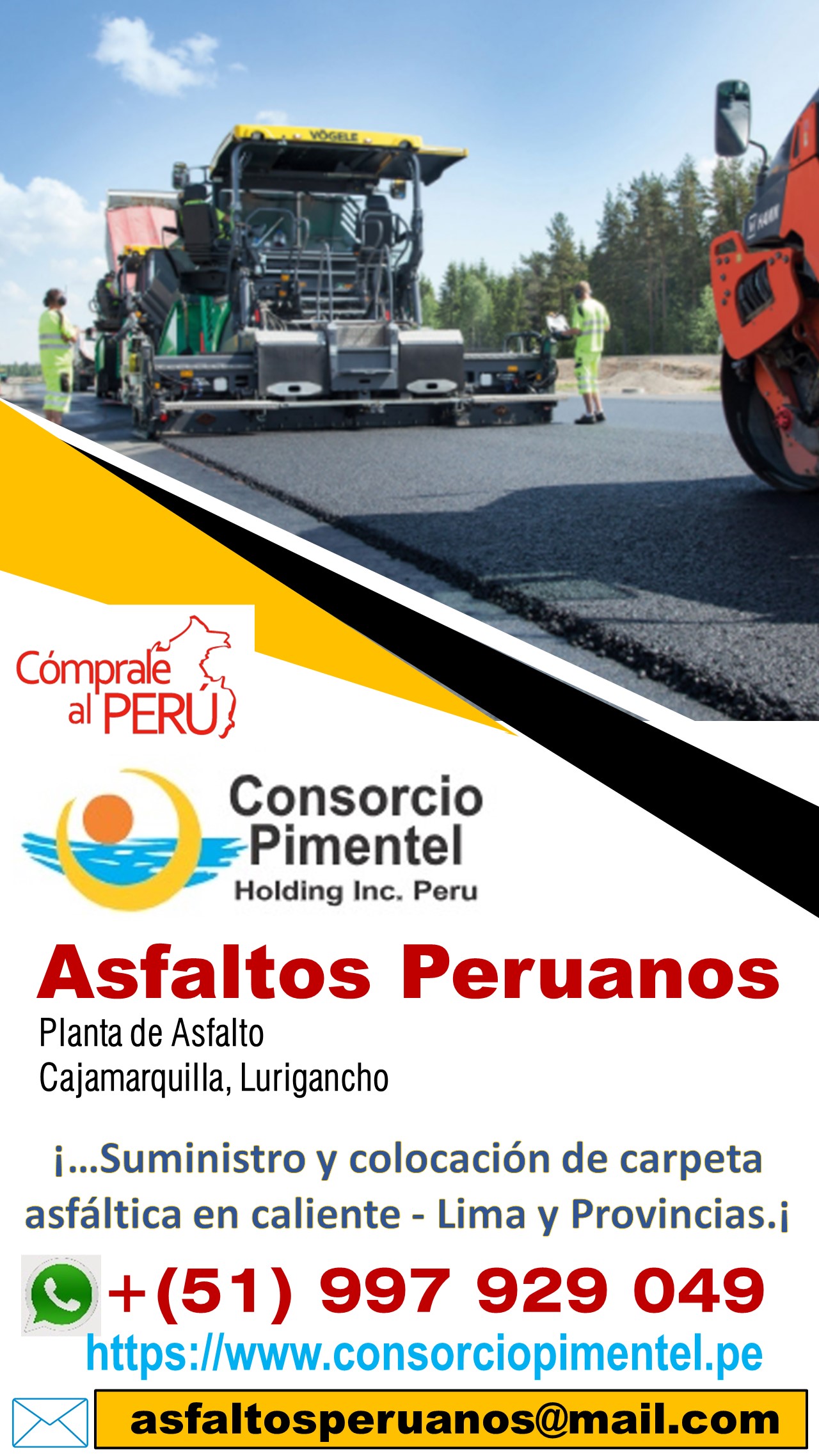 SUMINISTRO Y COLOCACION ASFALTO EN CALIENTE - LIMA, PROVINCIAS PERU 2025 ASFALTOS PERUANOS, en este año 2025 que está casi iniciando, como empresa especializada en Fresado y Asfalto e Imprimaciones reiniciamos nuestras actividades a partir de Marzo del 2022 y nos dedicamos a mantener los mejores estándares de calidad requeridos en la construcción de caminos, canchas deportivas, estacionamientos, obras viales, bacheo y obras civiles en general. Identificamos los problemas en tu carpeta asfáltica y proponemos soluciones. Entre los servicios que ofrecemos destacan: FRESADO ASFALTADO Y PAVIMENTACIONES – LIMA 2025 a) Vialidad – Afirmado y Pavimentación de Urbanizaciones b) Estacionamientos de condominios c) Estacionamientos comerciales y Estaciones de Servicio. d) Estacionamiento de zona de carga e) Obras Civiles, Movimiento de Tierras y Alquiler de Maquinarias. IMPRIMACIÓN Costo x m2 = S/. 6.80 Mas IGV (a Diciembre 2025) Riego de Liga Costo x m2 = S/. 6.50 Mas IGV ASFALTADO EN CALIENTE 2" = S/. 57.50 Más IGV (Consultar otros metrados) Fresado Asfalto Costo x m2 (Consultas metrado y Lugar de trabajo + Moviliz. Equipos) Contactarse con: Arq. Juan Fco. Yovera Cel. 997 929 049 (WhatsApp On Line) las 24 horas. Cel. +51 987 941 887 Email: asfaltosperuanos@mail.com Twitter: @consorciopiment http://www.consorciopimentel.pe Of. Jr. Augusto Durand N° 2615, Urb. San Luis, Lima 30. Planta de Asfalto: Cajamarquilla, Lurigancho – Lima.